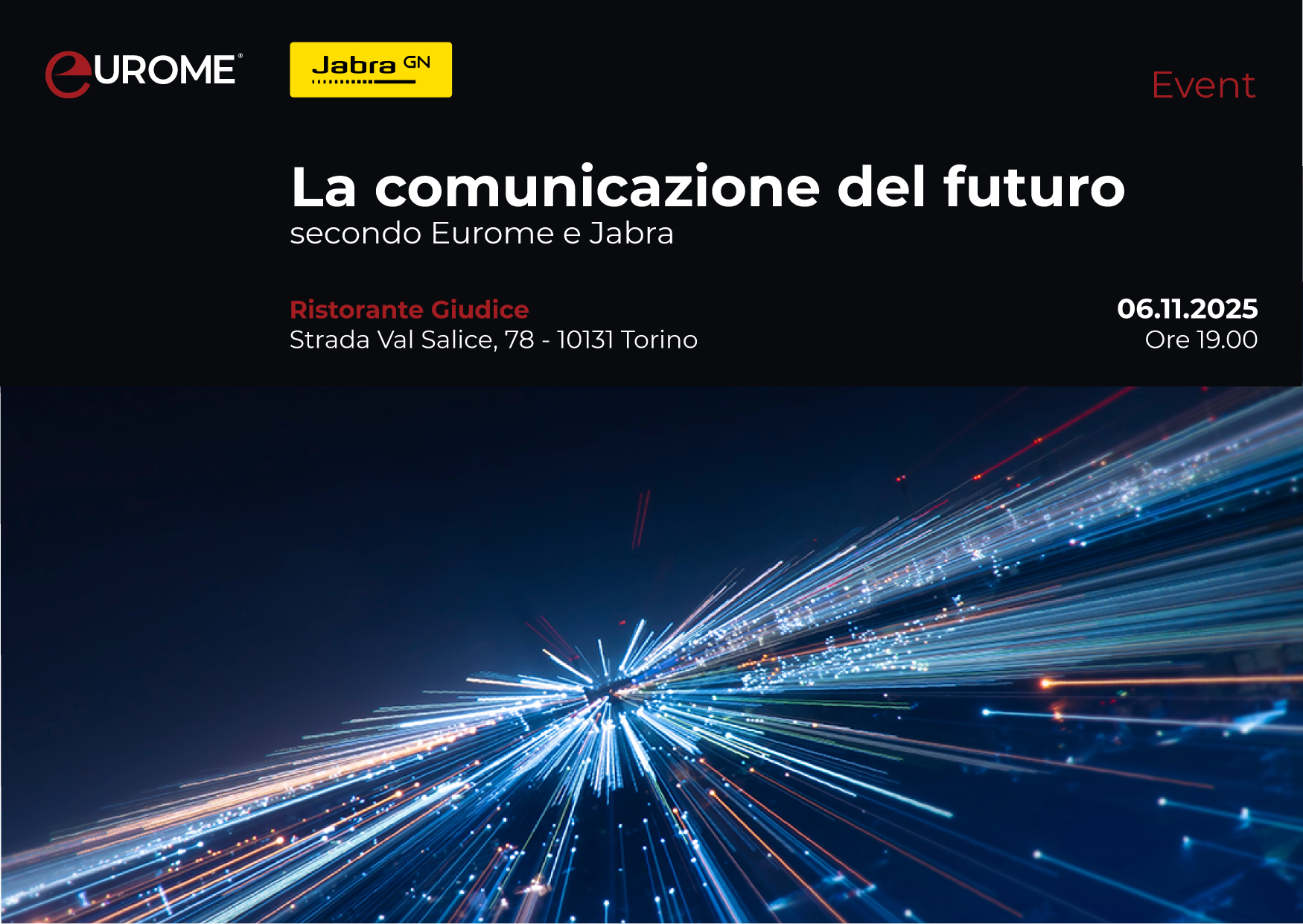 Il 6 novembre 2025, Eurome ha organizzato eventi esclusivi a Milano e Torino insieme a Jabra per presentare in anteprima i nuovi prodotti dedicati alla collaboration e alle moderne postazioni di lavoro ibride. I partecipanti hanno potuto testare dal vivo le ultime soluzioni Jabra per videoconferenza, cuffie professionali e speakerphone, apprezzandone qualità audio, funzionalità smart e integrazione con le principali piattaforme di comunicazione aziendale.